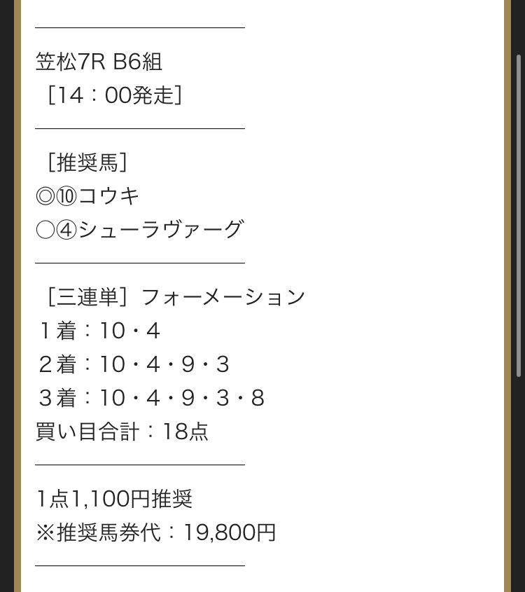 推奨金額通りに1点1,100円で18点、計19,800円の馬券を購入!
