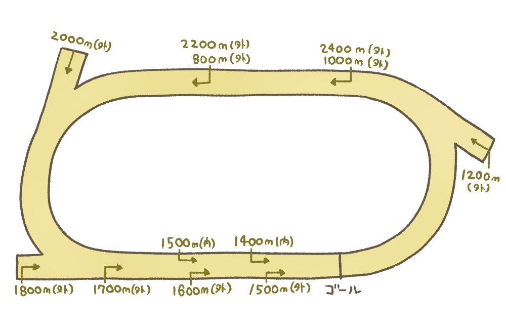 またスパイラルカーブが適用されているので、コーナーの入口は緩やかだが、出口はきついカーブとなっているため膨らみやすく、馬群がバラけるので馬群に包まれていた馬でもチャンスがある。