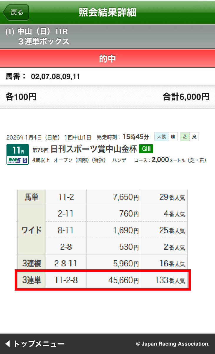【即PAT的中画像公開】中山金杯(G3)45,660円的中!