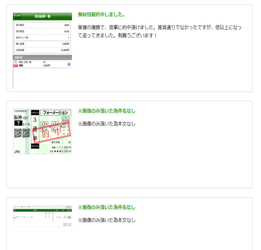 使う前にサイト内にこういう実際の会員の声や的中画像があると信用して使えますね。