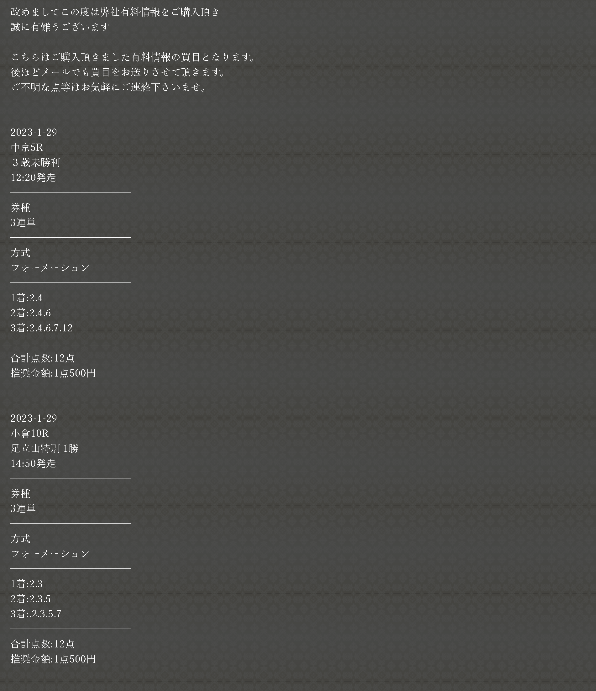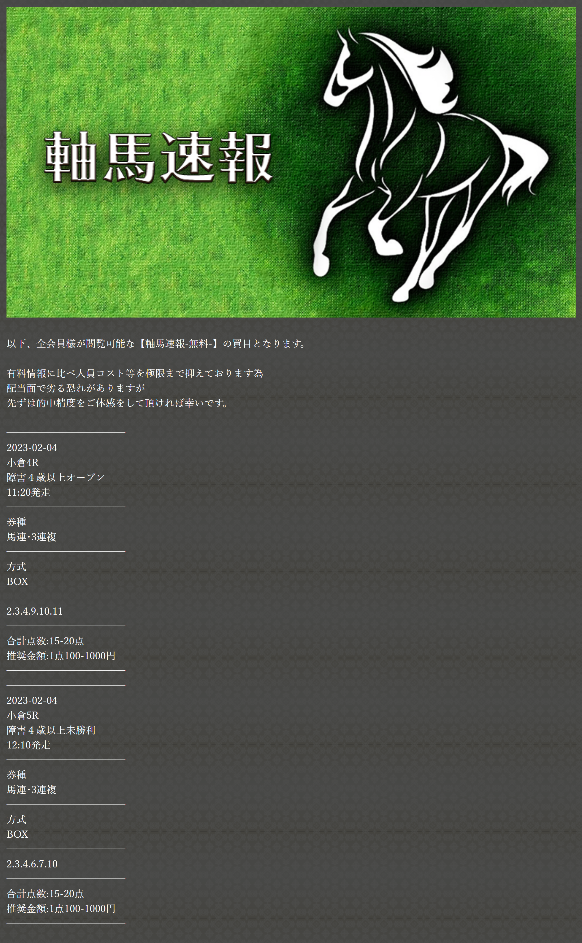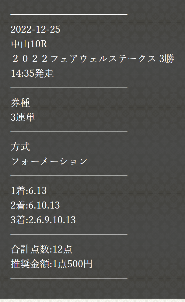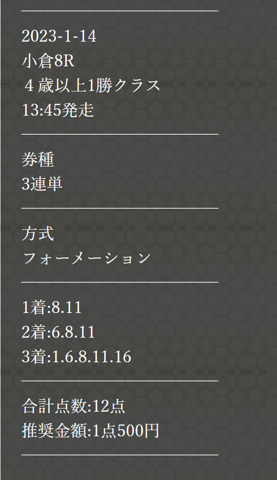 先々週も無料情報当たってたしここの予想見ておいて良かった!今週も的中頼みます!