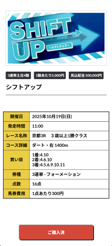 努力して情報収集して、ネット競馬の有料コンテンツ課金しても当たらないけど この予想、しかも何万も馬券代用意しなくても待望の10万馬券1504.7倍当たりました! しかも・・・ 4800円っていう1回の呑み代程度の資金で60万1880円ゲット!!!!! ティックトックでタスク完了させてコツコツポイ活で生活費稼いでたけどよっぽどこのサイトを見る時間に時間費やした方が稼げる! 数時間ポイ活しても数百円にしかならないなら競馬やった方が断然いいわ!